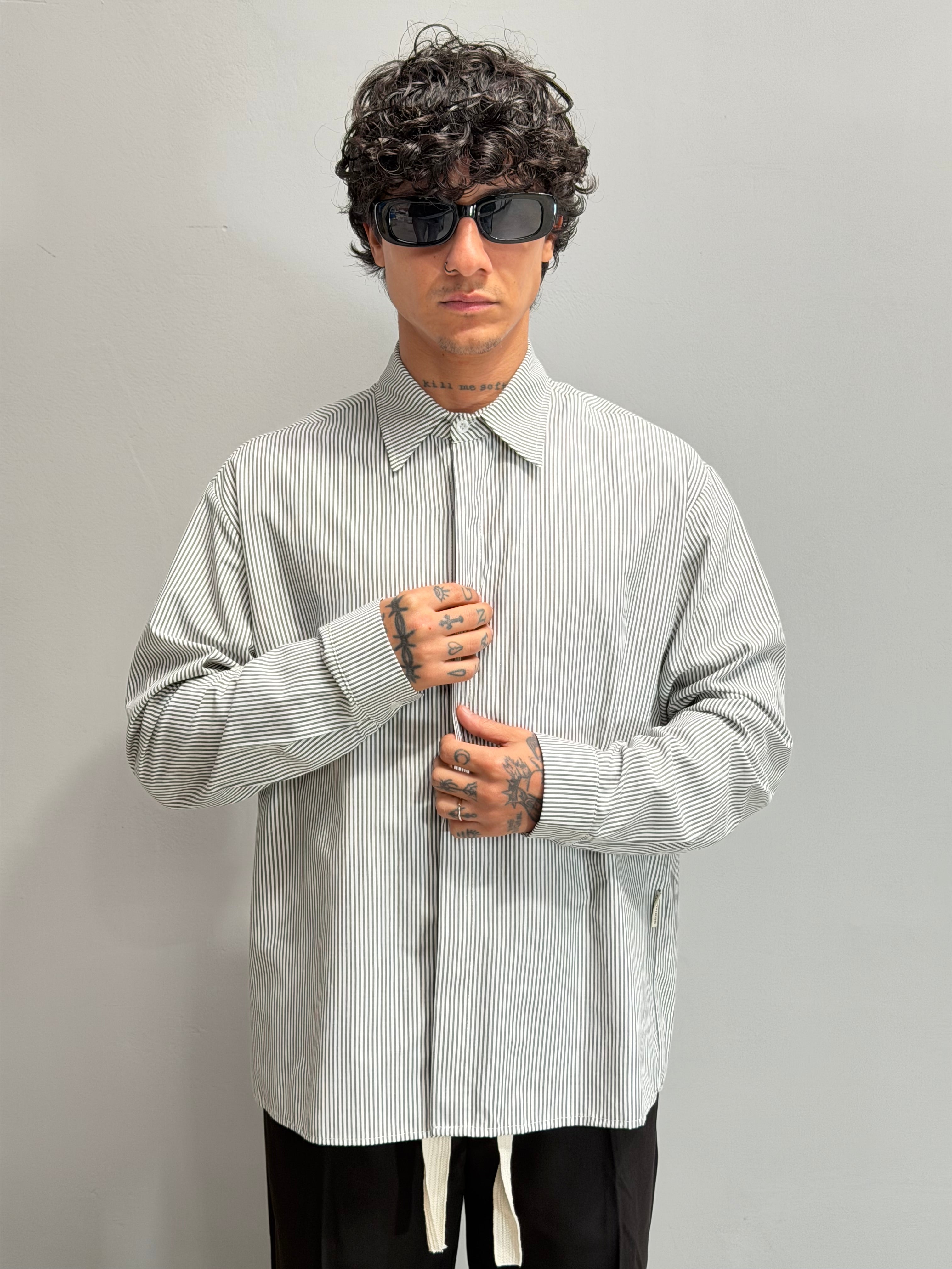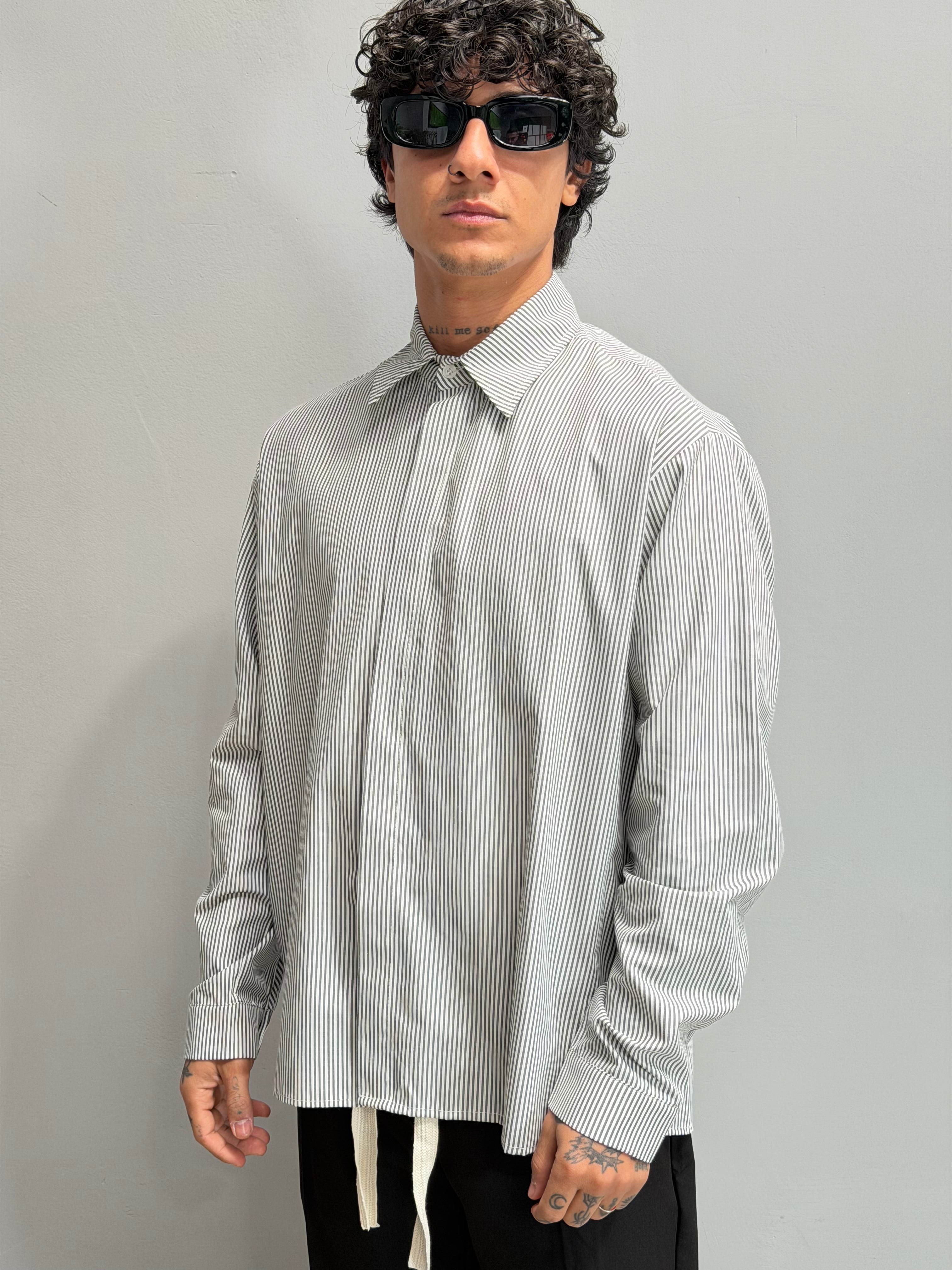 DescrizioneCamicia Kriss rigata nero con abbottonatura a scomparsa , fit versatile e adatto per ogni occasione.